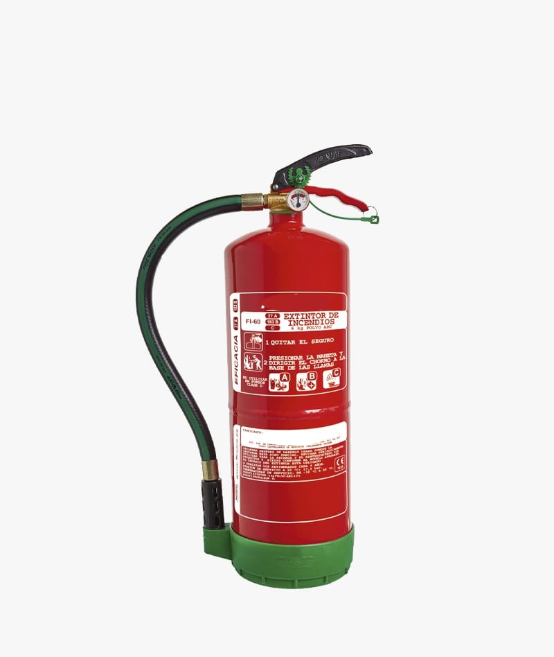 Extintor rojo para uso comunitario, contiene 6 kg de polvo ABC.